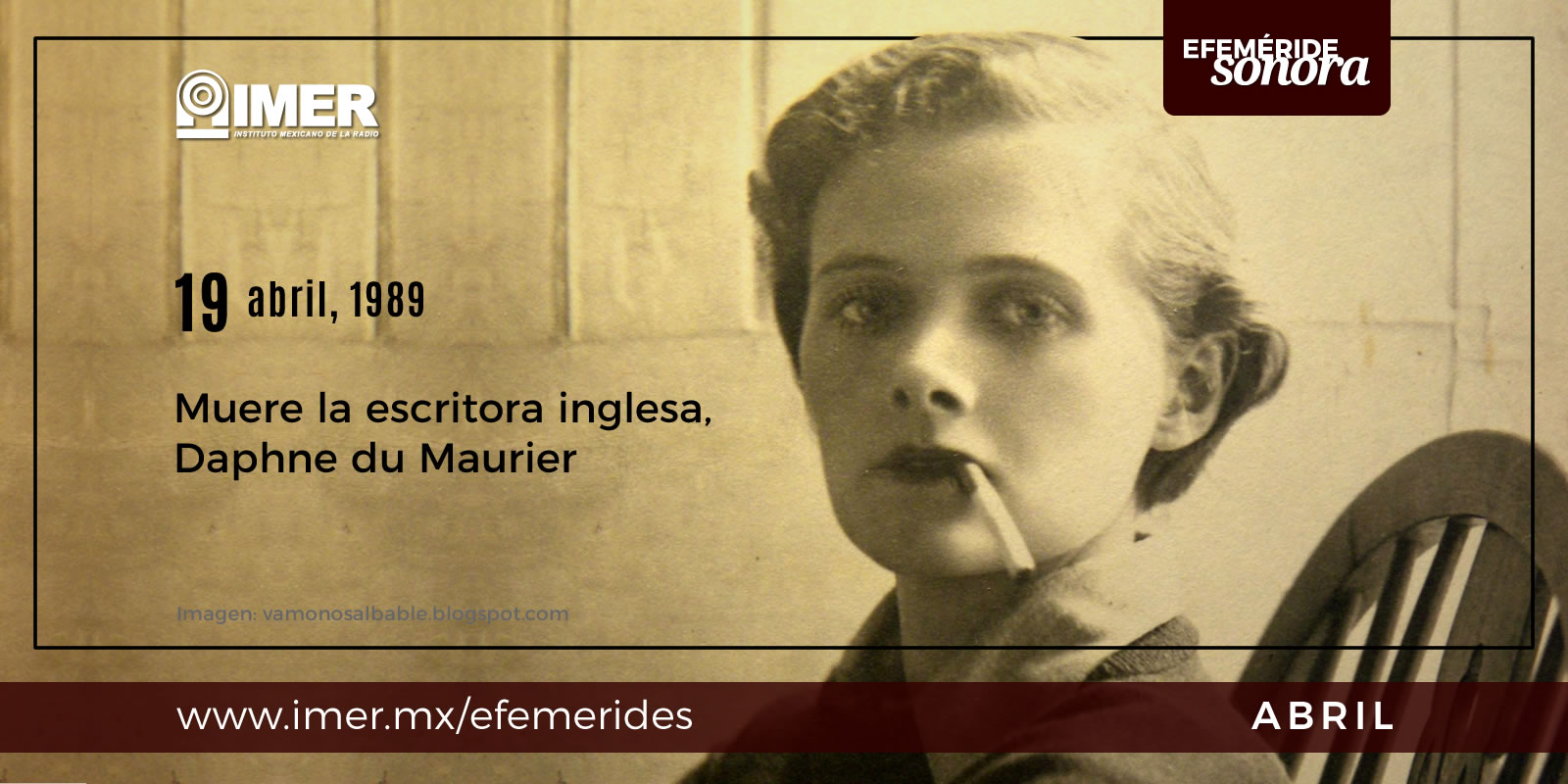 Muere Daphne du Maurier, escritora inglesa. Considerada una de las grandes escritoras de la literatura inglesa del siglo XX. Autora de “Los lentes azules”, “Una vida por otra” y “La cita”. Varias de sus novelas son llevadas al cine por Alfred Hitchcock como “Los pájaros” y “Rebeca”. Muere a los 81 años. Escucha “Los pájaros” narrado por Severo Mirón en el programa “Platícame un libro”, transmitido en 1988.