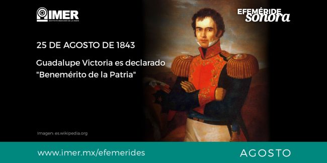 #EfemérideSonora El 25 de agosto de 1843, Guadalupe Victoria, primer presidente de México y figura destacada de la Guerra de Independencia, es declarado “Benemérito de la Patria”. Escucha el programa narrado y dramatizado “Memorias de una nación”, transmitido el 19 de octubre de 1985, en el que se presenta la biografía de Guadalupe Victoria.