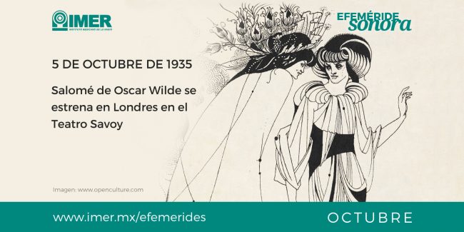 #EfemérideSonora El 5 de octubre de 1931, “Salomé” de Oscar Wilde se estrena en Londres en el Teatro Savoy. Salomé es el título de una tragedia de Oscar Wilde escrita en 1891 que muestra, en un solo acto, una versión muy personal de la historia bíblica de Salomé, hijastra del gobernante Herodes Antipas, quien pide…