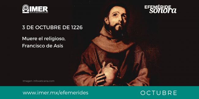 #EfemérideSonora El 3 de octubre de 1226, muere Francisco de Asís, religioso y místico italiano, fundador de la Orden Franciscana, de la orden conocida como Hermanas Clarisas y de una tercera orden seglar; todas surgidas bajo la iglesia católica de la edad media. Escucha a Ernesto de la Peña en su programa “Testimonio y celebración”,…