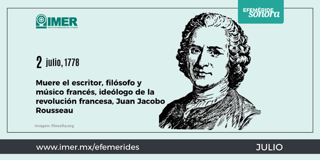 2 de julio de 1778, Muere Juan Jacobo Rousseau, escritor, filósofo y músico francés, ideólogo de la revolución francesa, autor de “El contrato Social” y “Discurso Sobre el Origen de la Desigualdad entre los Hombres”, “Discurso sobre las Ciencias y las Artes”.