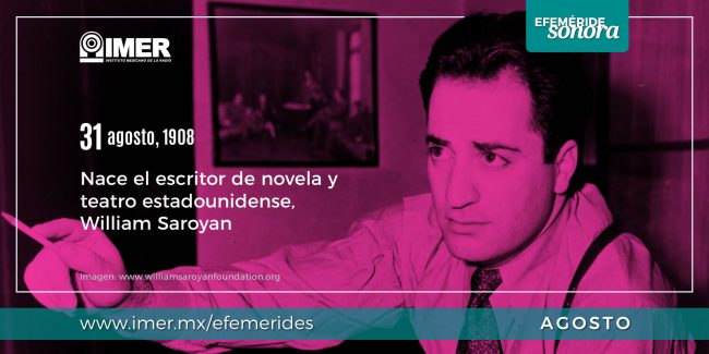 31 de agosto de 1908, Nace William Saroyan, escritor estadounidense de origen armenio de relatos para jóvenes, obras de teatro y novelas; famoso en la crisis económica de la década de 1930 por su estilo idealista y de gran entusiasmo.