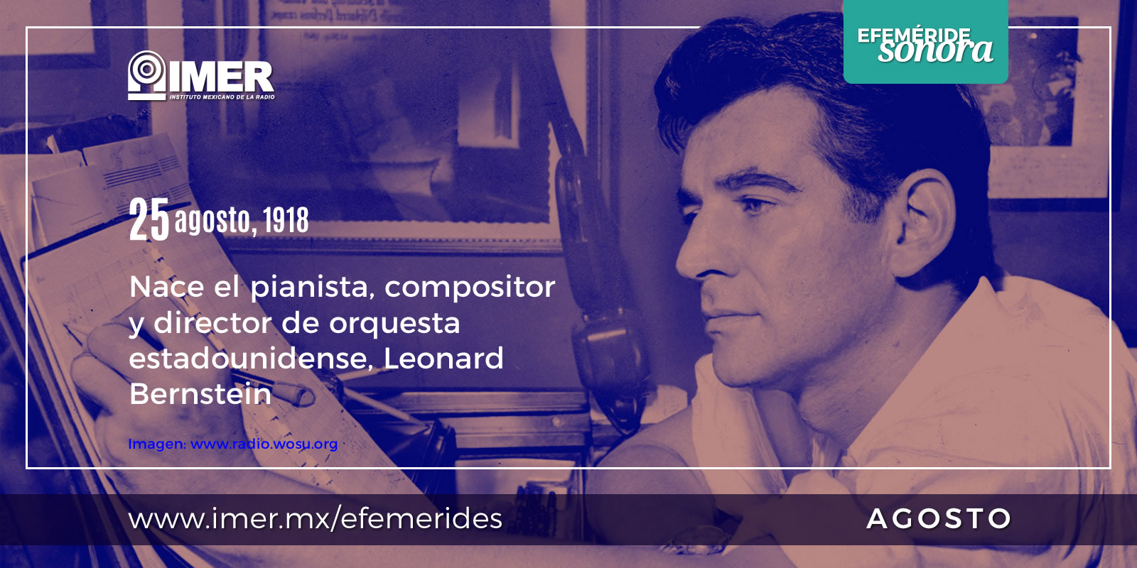 Nace Leonard Bernstein, pianista, compositor y director de orquesta estadounidense de fama mundial. A los 27 años es nombrado Director de la Orquesta Sinfónica de Nueva York, asimismo dirige las principales orquestas del mundo: Sinfónica de Londres, Viena, Francia e Israel. Por 20 años presenta en televisión sus “Conciertos para jóvenes”. Muere a los 72 años. Escucha la vida y obra de Leonard Bernstein en el programa “Los niños tienen la batuta”, transmitido en 2006.