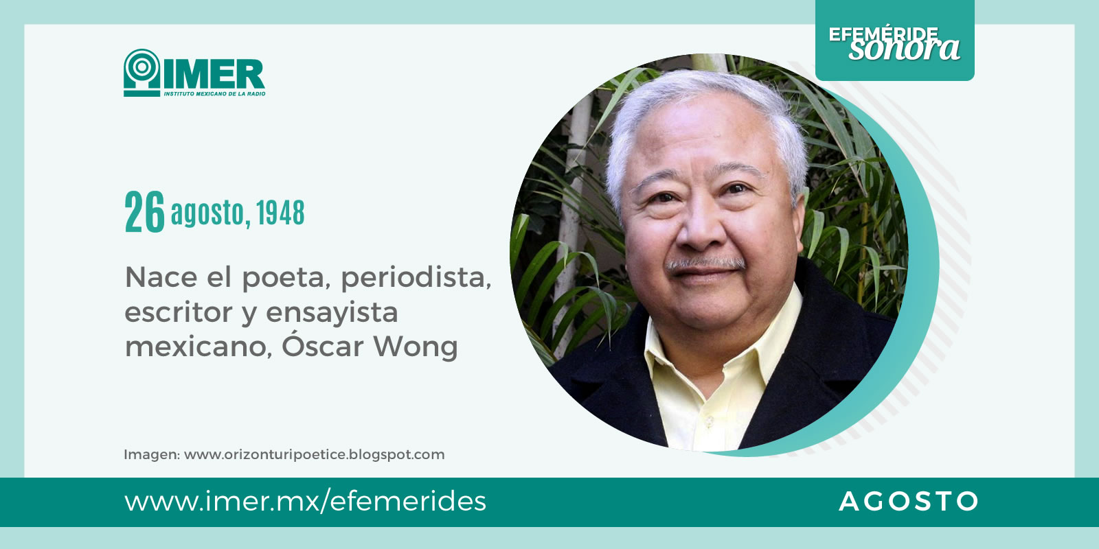 Nace Óscar Wong, poeta, periodista, escritor y ensayista mexicano. Recibe varios premios nacionales e internacionales, autor de “Hacia lo eterno mínimo”, “A pesar de los escombros”, “Piedra que germina”, “Rubor de la ceniza”. Escucha al chiapaneco Oscar Wong entrevistado por Jorge Meléndez en el programa “Después de la letra, la palabra”, transmitido en 2003.