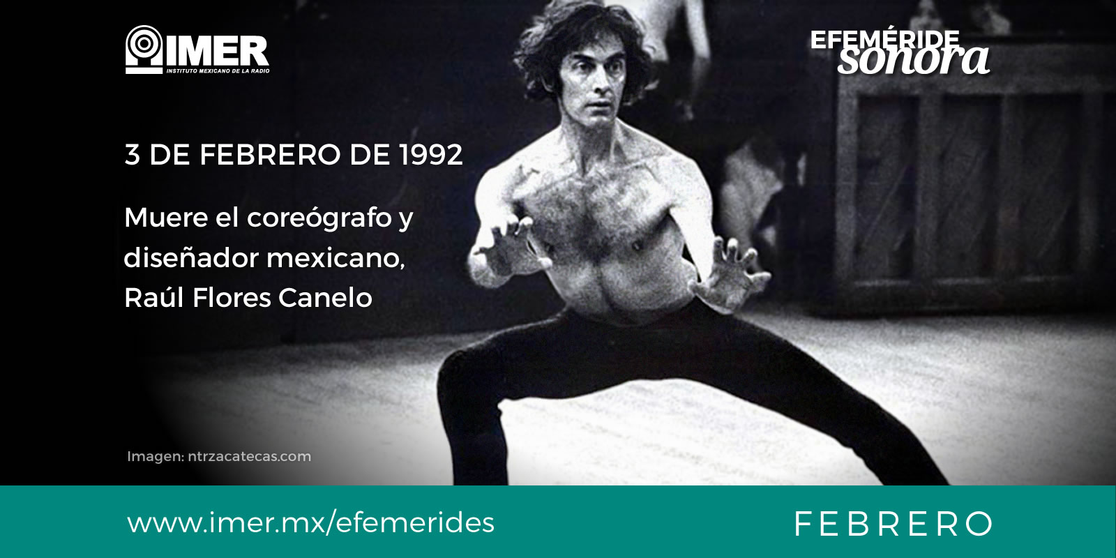 #EfemérideSonora El 3 de febrero de 1992 muere Raúl Flores Canelo, bailarín, coreógrafo y diseñador mexicano. De las principales aportaciones se encuentra la introducción de la mexicanidad y el nacionalismo crítico en la Danza Contemporánea, convirtiéndose en uno de sus grandes pilares e innovadores, fundador del Ballet Independiente en el año 1966, una de las compañías de danza más importantes de México.