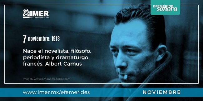 7 de noviembre de 1913, Nace Albert Camus, novelista, filósofo, periodista y dramaturgo francés, su obra refleja su postura de izquierda, la defensa de los ideales de la verdad y la justicia.