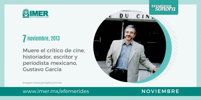 7 de noviembre de 2013, Muere Gustavo García, crítico de cine, escritor y periodista mexicano. En su trayectoria conduce diversos programas de radio y televisión. Académico del CUEC, la UNAM y la UAM.