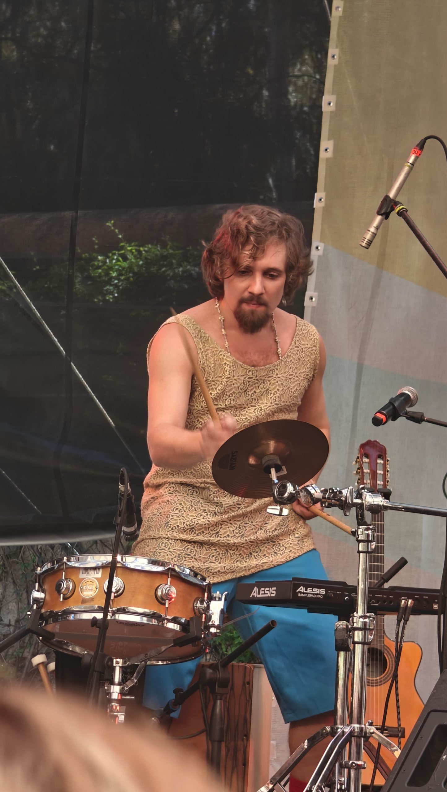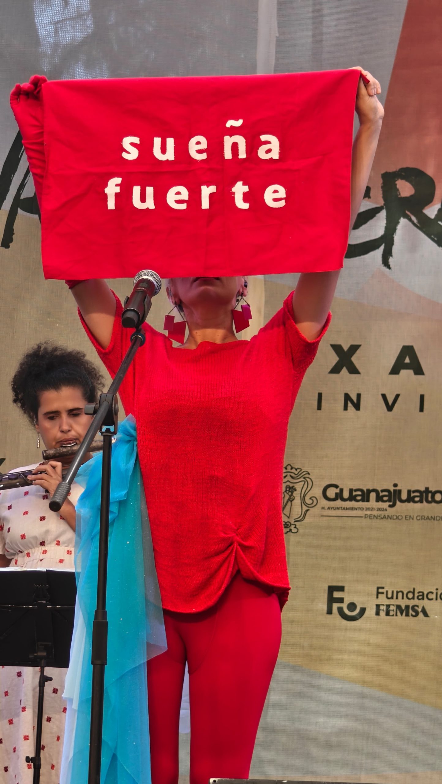 Cinco músicos sobre el escenario, que llenaban todos los espacios, en veces con guitarras, otras pandero o percusiones, bajo y flautas o simplemente atmosferas con caracoles y el cajón. Se puede sentir las raíces brasileñas de la samba, pero también el jazz esta presente e incluso folk sonó durante esta presentación.