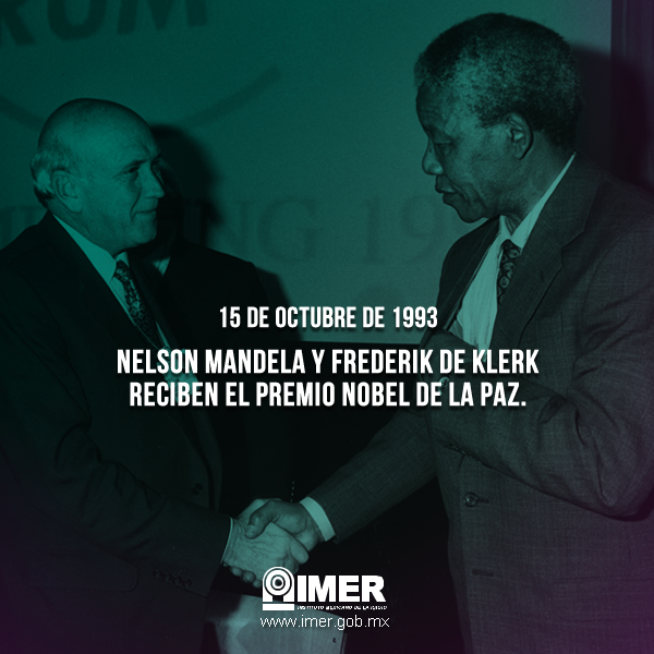 15 de octubre de 1993 Nelson Mandela y Frederik De Klerk, políticos sudafricanos, reciben el Premio Nobel de la Paz por acabar con el apartheid.