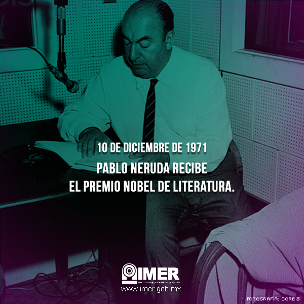 10 de Diciembre de 1971, Pablo Neruda, poeta y militante comunista chileno, recibe el Premio Nobel de Literatura por una poesía que con la acción de una fuerza elemental da vida al destino y los sueños de un continente. martes 10 de diciembre de 2013 Compartir esta publicación: Share on FacebookShare on Facebook Share on XShare on X Share on WhatsAppShare on WhatsApp Related posts31 de marzo de 1727: Fallece el matemático y físico Isaac Newtonviernes 31 de marzo de 202330 de marzo de 1932: Se estrena la película “Santa”jueves 30 de marzo de 202329 de marzo de 1982: Fallece el compositor y director de orquesta Carl Orffmiércoles 29 de marzo de 202328 de marzo de 1942: Nace el cantante de ópera Samuel Rameymartes 28 de marzo de 202327 de marzo de 1972: Fallece el artista holandés M.C. Escherlunes 27 de marzo de 202326 de marzo de 1827: Fallece el músico alemán Ludwig Van Beethovendomingo 26 de marzo de 2023