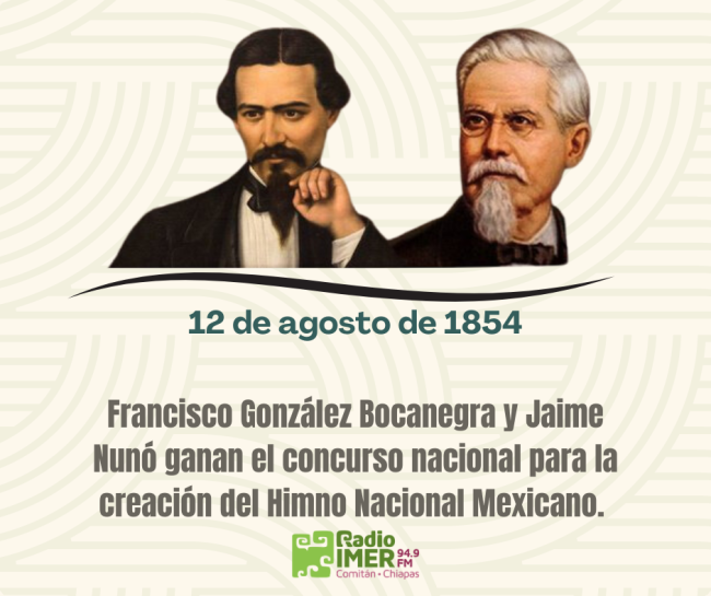 12 DE AGOSTO DE 1854 EfémeridesPor Radio IMERlunes, 12 de agostoDeja un comentarioFrancisco González Bocanegra y Jaime Nunó…