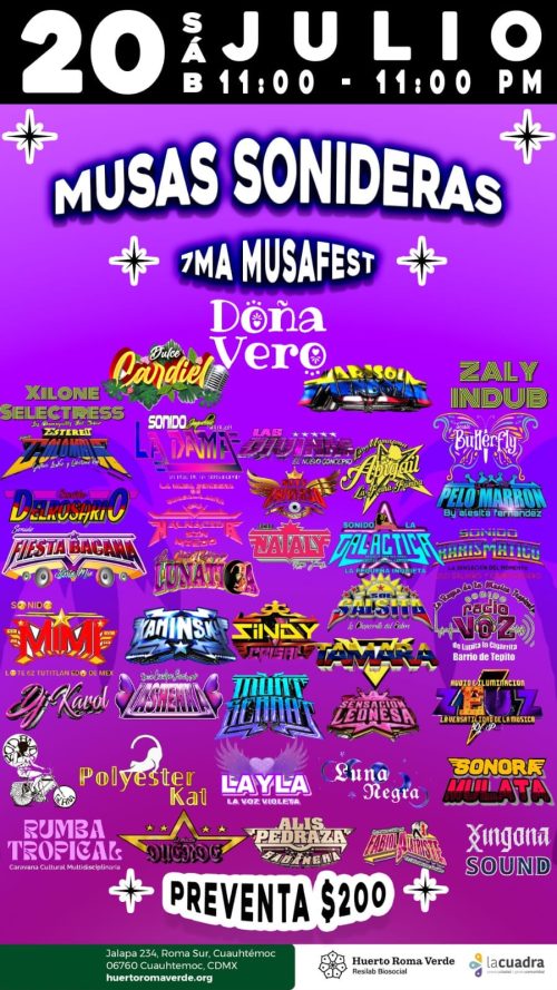 La celebración del séptimo aniversario de Musas Sonideras tendrá lugar el 20 de julio en Huerto Roma Verde, de 11:00 a 23:00 horas. Los boletos están disponibles en preventa por $200 y el día del evento por $250. Puedes adquirir tus boletos en Doña Vero, Huerto Roma Verde y a la salida del metro Popotla con Marisol Mendoza.